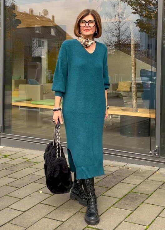 - Прямое трикотажное платье сине-зеленого оттенка – удачный выбор для зимних образов. Модель прямого силуэта с пышными рукавами длиной три четверти и треугольным вырезом. К образу с платьем добавили шейный платок, высокие сапоги-ботинки на шнуровке, а также такой эффектный аксессуар, как сумка из искусственного меха черного меха.