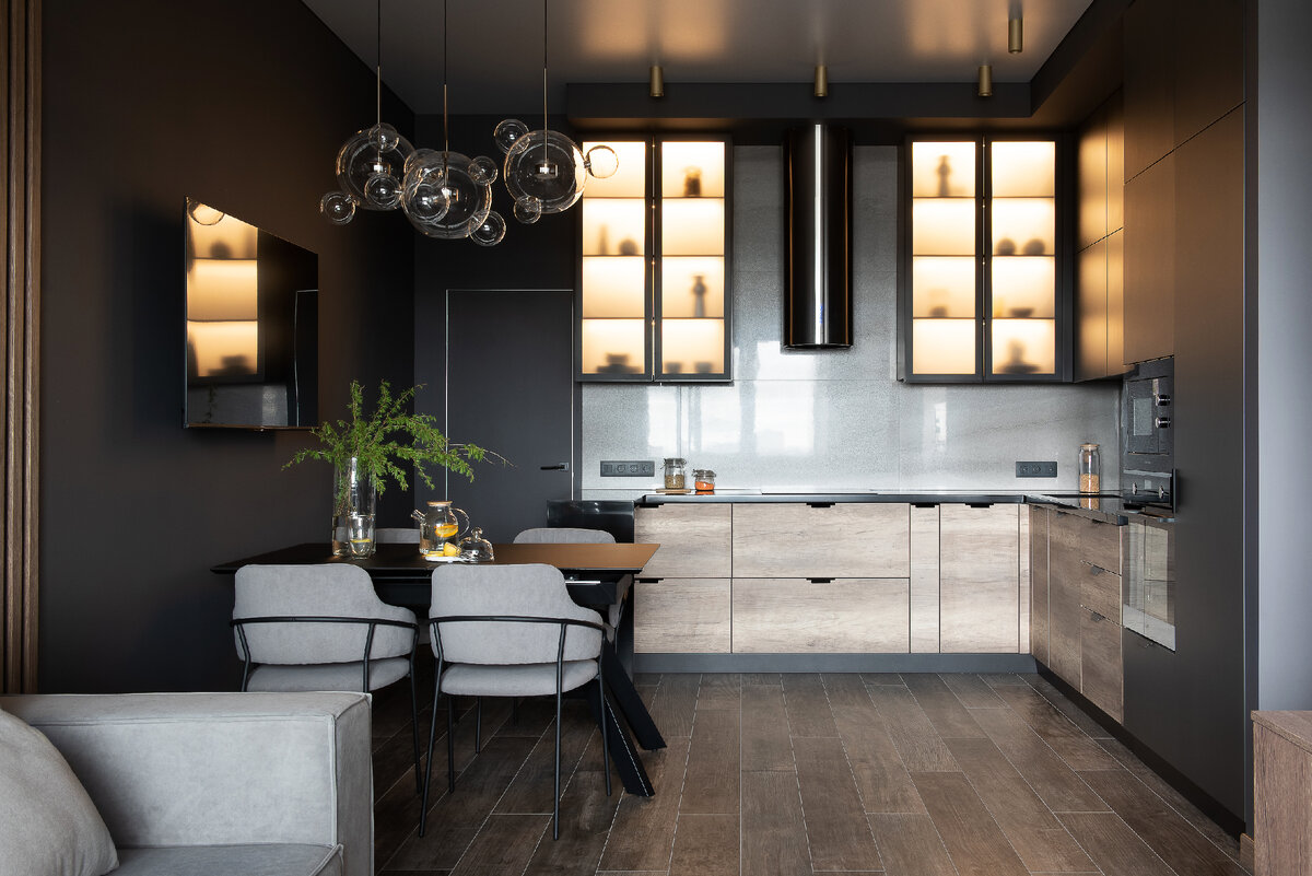 Дизайнер Юлия Гельбург создала проект для пяти человек: семейной пары и их сыновей — старшего и двух пятилетних близнецов. Дизайн квартиры получился функциональным и удобным для всех жильцов. Подробнее о решениях — читайте в материале. Самым важным для заказчиков было сделать спальню тихой и максимально удаленной от детских комнат. Мы полностью шумоизолировали взрослую спальню, чтобы обеспечить комфортный отдых. В этой комнате также размещено рабочее место, которое можно отделить шторой от кровати. Второй home-office расположился на балконе кухни. Центральное место в квартире, конечно, кухня-гостиная. Здесь располагается ТВ-зона с уютным диваном и отдельная зона для готовки. Кухонный гарнитур имеет подсветку рабочей поверхности и витрин для красивой посуды. Также кухня оснащена встроенной техникой, мощной вытяжкой островного типа, встроенным однодверным холодильником, а морозильная камера предусмотрена в небольшой кладовой комнате за кухней. Поверхность столешницы выполнена из акрилов