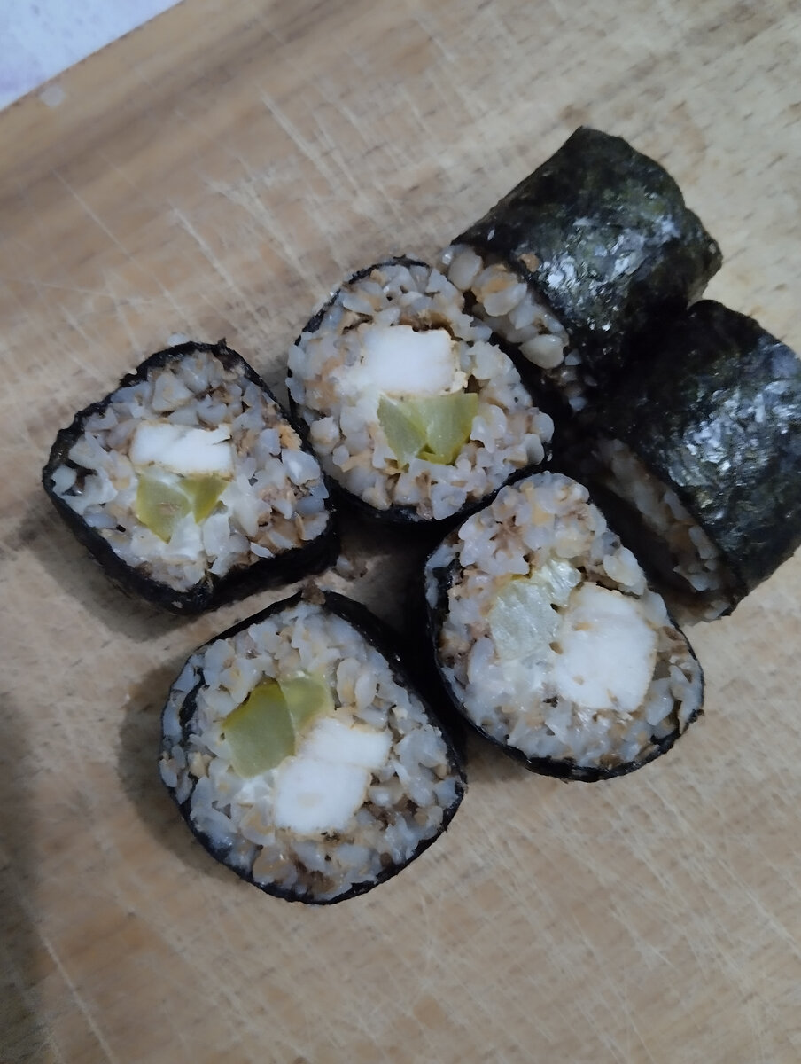 Давайте приготовим необычные роллы. С гречкой и курицей. Берём куриную грудку и режем её полосками. Специи для курицы (у нас прованские травы и сушёный чеснок) 1 ст.ложка соевого соуса. 2 ст.ложки растительного масла. Перемешали и оставили мариноваться на 30 минут. А в это время поставили гречку вариться. Варим до готовности, примерно 20 минут. Нарезаем маринованные огурчики. Обжариваем курицу, минут 5, не больше, иначе она будет сухой. И приступаем к сборке. На лист нори кладём гречку. Затем полоску майонеза. Огурчики и курица. Теперь сворачивает и нарезаем. Наслаждаемся. Приятного аппетита!