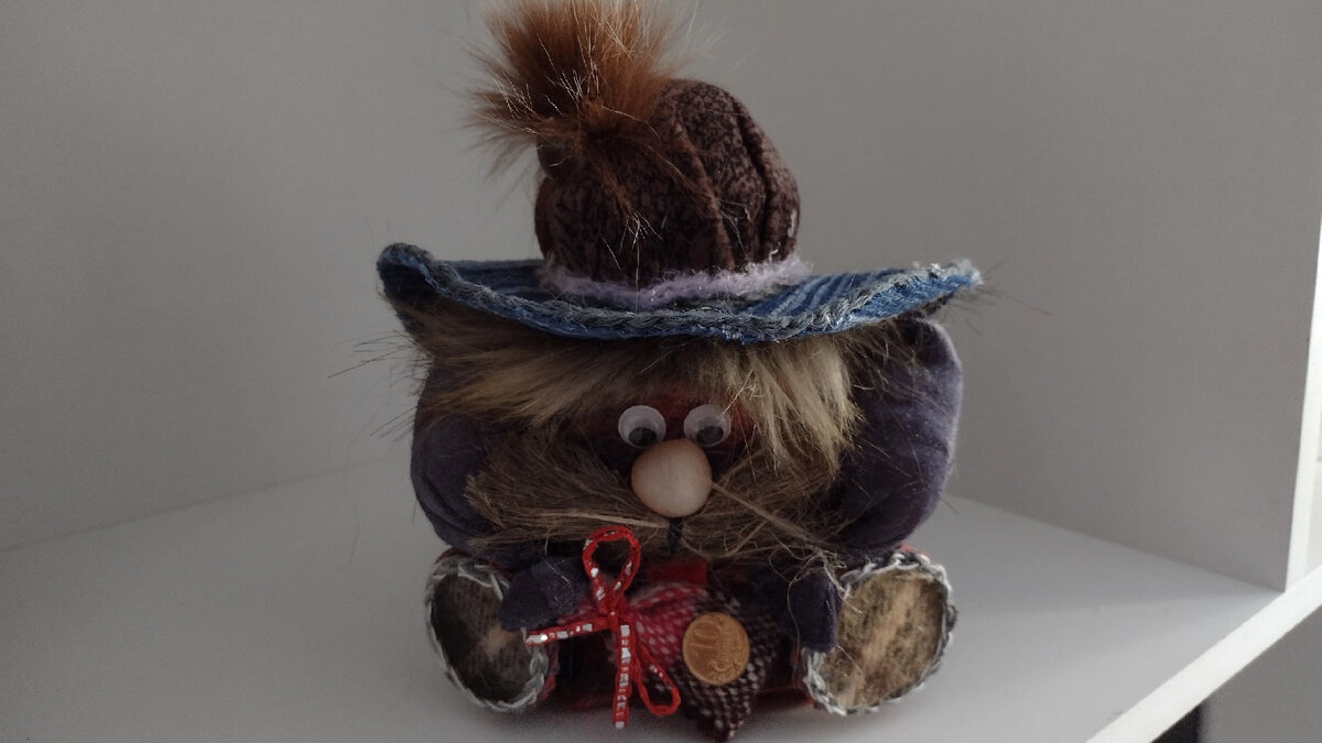 Домовой приходит к нам в дом не с пустыми руками, а с мешком богатства. Обычно поделка дарится «на достаток», и поэтому на мешочек, который домовенок держит в руках, приклеивается монетка (любого достоинства, например, 10 копеек). Номинал значения не имеет. Мешочек выкраивается из мешковины или любой понравившейся яркой ткани, набивается синтепоном, синтепухом или ватой, сверху завязывается шпагатом или атласной ленточкой.
