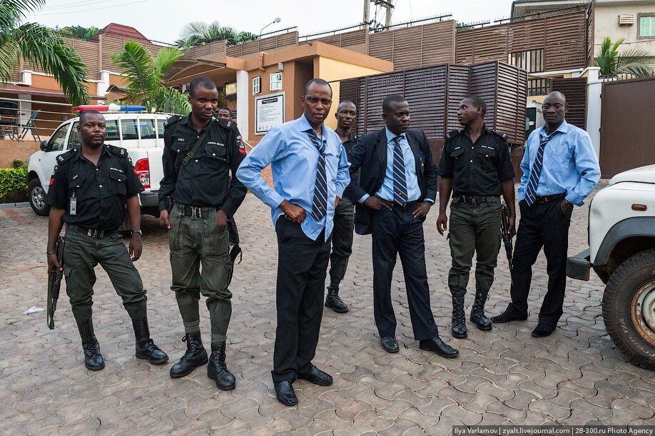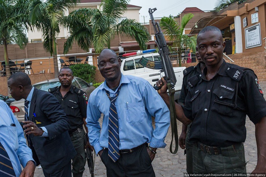 19. Остановились на обед. Вообще охрана работает довольно расслаблено. В Сомали было веселее, когда перекрывали улицы и зачищали их. В Нигерии полицию судя по всему не очень уважают.