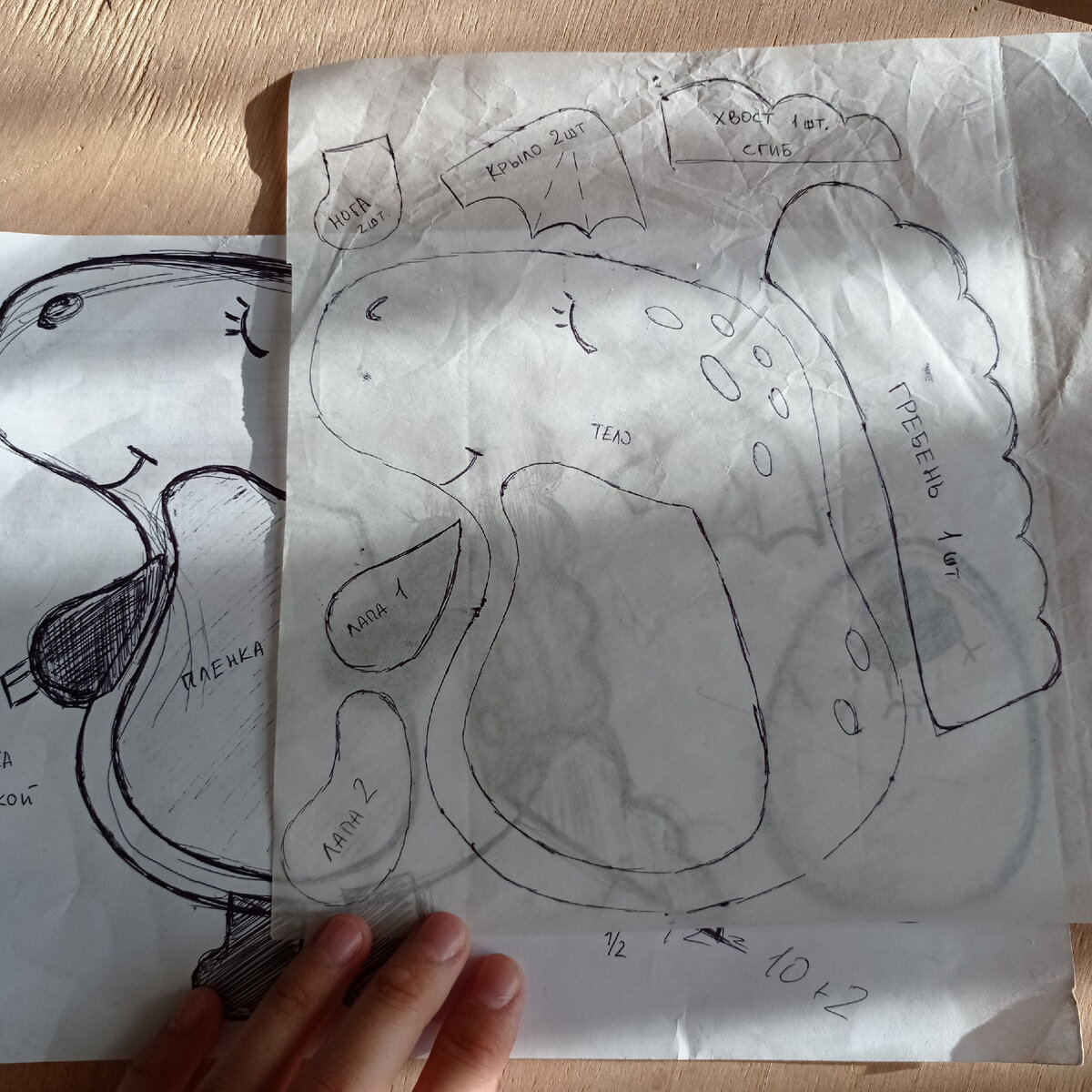Я ходила с этой идеей несколько дней. Но для начала нужно было создать выкройку. Первоначальные наброски были сделаны на каком-то черновике. Уже позже я перевела готовый вариант на кальку.