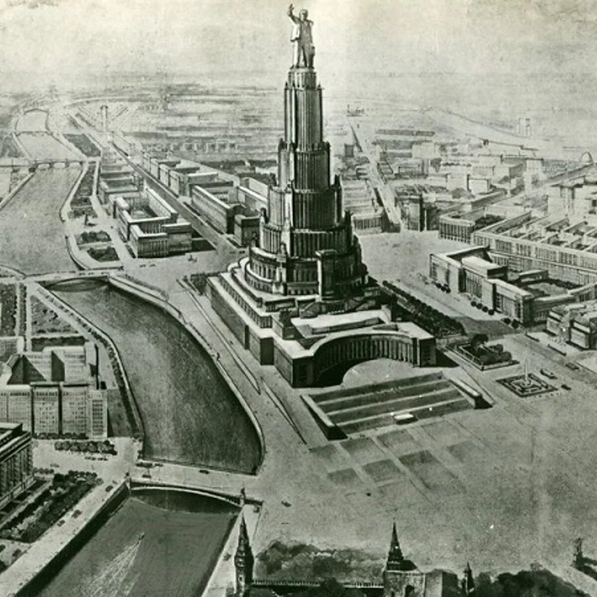 Дворец Советов - это неосуществленный проект строительства высотного административного здания в Москве для проведения сессий Верховного Совета СССР и массовых демонстраций. Проект был разработан архитектором Борисом Иофаном и предполагал, что высота Дворца Советов вместе с венчающей его стометровой статуей Владимира Ленина составит 415 метров. Дворец должен был стать центром новой советской Москвы и самым высоким зданием в мире, символизирующим победу социализма. Однако, строительство не было завершено, так как на месте предполагавшегося строительства был взорван храм Христа Спасителя. Сегодня на месте Дворца Советов находится площадь, а рядом с ней находится станция метро "Кропоткинская", которая называлась"Дворец Советов" и была построена специально для обслуживания Дворца