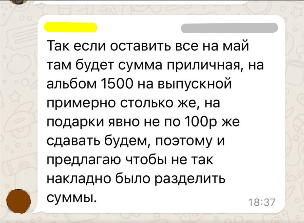 В этом году, мой ребенок выпускается из садика, соответственно к выпускному потребуется не мало денег. К этому я морально готова, да и финансово тоже уже подготовлена (относительно). Близится новый год и родительский комитет группы занят подготовкой к этому празднику, но одна мамочка заволновалась, что к выпускному пора собирать деньги. Её комментарий можно прочитать на скрине ниже: Что меня тут сразу зацепило Зная, что на альбом точно надо 1500 рублей, она не отложила у себя в кошельке эту сумму, и не внесла предоплату, когда это делали, а просто проигнорировала этот факт и ждёт, чтобы выделить эти деньги из зарплаты, когда попросят сдать. Вопрос: зачем так делать? Если знаешь, что надо будет 1500р, есть деньги сейчас в чем проблема отложить их в отдельную копилку или счёт, на полку в прихожей, в конце концов. Но нет, веселее подождать до мая, и когда объявят сбор охать и ахать, что денег до зп не хватает. Я молчать не стала, написала о том, что она может уже сейчас начать отклад