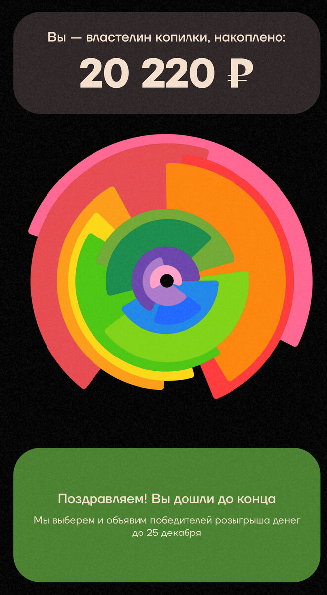 Добрый день! Вот и закончился челлендж от банка Тинькофф по накоплениям в инвесткопилке. Что это такое, я писала здесь: Последняя, 15 неделя наступила с понедельника и я отправила в копилку финальные 1500 рублей. И сразу увидела сообщение, с поздравлениями - челлендж пройден до конца! В копилке же лежит немного другая сумма, т.к копить начала не с нуля. Почти 23 тысячи накоплено за 3,5 месяца. И перед окончанием челленджа, когда деньги уже можно снять, копилка ушла в минус. Т.к средства, которые лежат на счету инвестируются в Тинькофф Капитал. Ушла в минус - упала стоимость акций. Но акции так же могут и подняться, поэтому деньги пока не вывожу, дождусь небольшого плюса. Помимо понятной пользы - скопила денег, Тинькофф еще обещает призы. Но не всем, само собой. 1 приз в миллион рублей и 100 призов по 10 тысяч. Победителей определят с помощью генератора случайных чисел до 25 декабря, а выплатят призы даже в этом году до 31 декабря. Надеюсь или что-то выиграть? Да не особо, но к