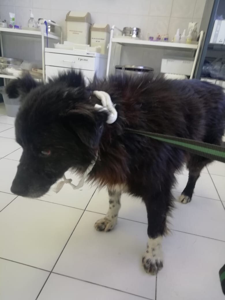Пес Черный жил на Ленина, кураторы присматривали за ним, кормили, на жизнь он не жаловался. Потом кураторы заметили, что пес не может сходить в туалет длительное время и очень плохо себя чувствует. Рентген показал каловые массы, при визуальном осмотре обнаружили опухоль в паховой области. При дальнейшем обследовании выяснилось, что это не опухоль, а грыжа, в нее выпал кишечник под кожу. Из-за того, что кишечник передавился в нескольких места, образовались каловые массы. Чтобы не подвергать риску жизнь собаки, кишечник прооперировали. Уход после таких операций требуется тщательный, иначе положительного результата не будет. В приюте сложно обеспечить круглосуточный уход, поэтому Черный долго находился на стационаре. Сейчас пес в приюте, лечение закончено, но контроль за состояние кишечника постоянный. Пес Черный уже очень взрослый, всю свою жизнь он, вероятно, провёл на улице. Пёс умный, иначе до столь преклонного возраста просто не дожил бы, скитаясь по городу. Жил бы он и дальше как пр