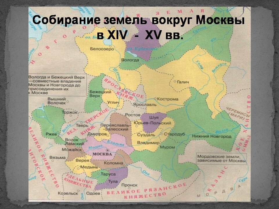 К XIV веку в Северо-Восточной Руси действительно проявилась тенденция к объединению земель в единое государство, что было обусловлено рядом факторов, как политических, так и социально-экономических. Основным движущим началом этого процесса стала необходимость создать военно-политическое объединение для защиты от внешних угроз, таких как литовская экспансия с запада и татаро-монгольская Орда с востока. Ликвидация зависимости от Орды стала ключевым аспектом формирования российской государственности. Политические факторы, такие как усиливающееся внимание к централизованной власти и необходимости в единстве, оказали решающее влияние на процесс объединения. В отличие от стран Западной Европы, где экономические факторы играли большую роль в государственном строительстве, в России этот процесс был в значительной степени определен политической борьбой и необходимостью ориентироваться на внешний и внутренний контроль. Московское княжество, сформированное в 1276 году, с первым князем Даниилом Александровичем, стало ключевым центром объединительных процессов. Княжество активно расширяло свои территории за счет соседних владений и контролировало важные торговые и транспортные пути. так к Московскому княжеству были присоединены Коломна, Переяславль и можайск в период с 1301 по 1303 годы. Политическая мудрость московских князей, в частности Ивана Калиты, который смог объединить вокруг Москвы другие земли, получить ярлык на Великое Владимирское княжение и право сбора дани со всех русских земель для Орды, сыграла решающую роль в укреплении власти Московского княжества. В дополнение к политическим факторам, социально-экономические изменения, такие как восстановление сельского хозяйства, развитие городов и ремесел, также способствовали укреплению единства и стабильности. Рост производительных сил создал основу для усиления государственных структур. Таким образом, процесс объединения русских земель в XIV веке был сложным и многогранным явлением, в котором социальные, экономические и политические факторы неразрывно переплетались, что в конечном итоге привело к созданию более централизованного и устойчивого государства. В процессе создания Московского государства и его объединительной политики присутствует множество ключевых элементов, которые подчеркивают сложность и многогранность исторических изменений. Основными факторами этого процесса были как внутренние, так и внешние противоречия, с которыми сталкивались московские князья.
