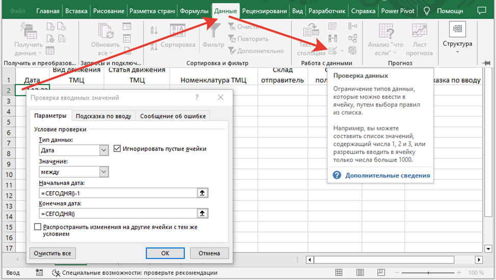 На ноутбуке кладовщика был создан новый файл: «Складской учет» Лист 1 этого файла переименован в Движение. Верхней строке этого листа были размещены названия соответствующих столбцов таблицы: в ячейке A1 – Дата, в ячейке B1 – Вид движения ТМЦ, в ячейке C1 – Статья движения ТМЦ, в ячейке D1 – номенклатура ТМЦ, в ячейке E1 – Единица измерения, в ячейке F1 – Склад отправитель, в ячейке G1 – Склад получатель, в ячейке H1 – Количество, в ячейке I1 – Подсказка по вводу. Во второй строке с ячейками произведены следующие манипуляции: 1. Ячейка A2 – установлен формат Дата, в разделе меню Данные\Проверка данных установлены ограничения по возможным для ввода в ячейку данным – дата в интервале вчера-сегодня: 2. В ячейке B2 настроен раскрывающийся список, для этого в файл добавлен новый лист, получивший наименование Справочники. В ячейке А1 этого листа введено наименование справочника Виды движения ТМЦ, а выделив диапазон ячеек A1:A2 и выбрав в разделе меню Вставка\Таблица указанный диапазон превр