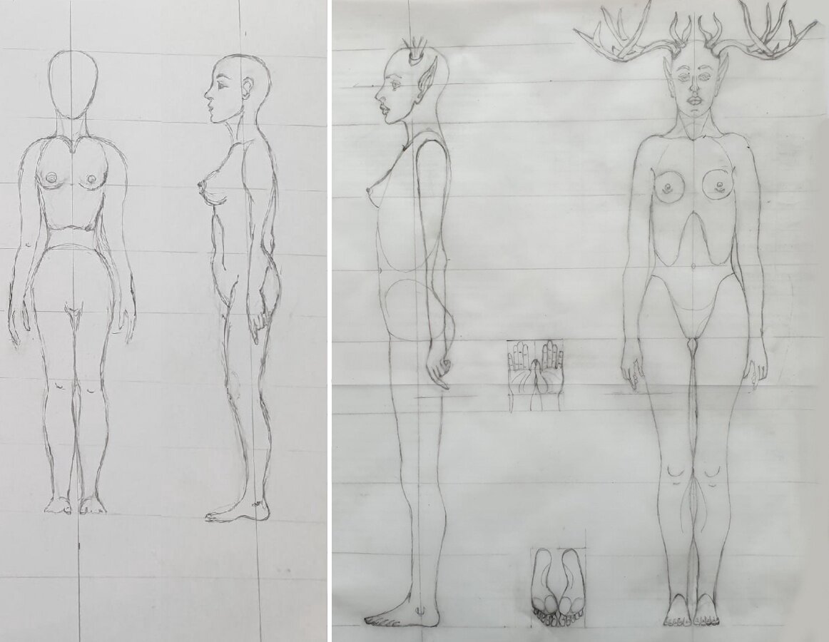 Несколько работ людей. Рисунок до курса "Прописная анатомия" и те же персонажи после. Далее из рисунков были созданы выверенные чертежи. Считаю что великолепно поработали и совершили грандиозный скачек. Умнички и молодцы!