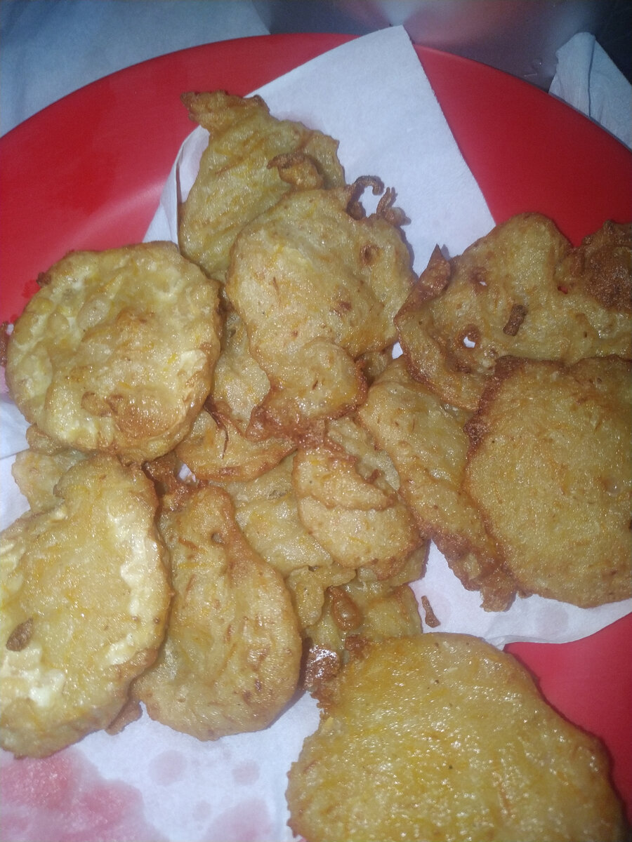 Вариант первый. Нарезать картошку соломкой. Смешать пшеничную муку (четыре столовых ложки), соль (1/2 чайной ложки) и сахарный песок (10 граммов), добавить воды до консистенции теста для оладий (чтобы не сразу с ложки стекало). Насыпать туда порезанную картошку, хорошо обвалять и пожарить в большом количестве масла (я жарю в пальмовом масле, но можно и в любом другом). Вариант второй. На мелкой тёрке натереть картошку, морковь и капусту (картошки побольше, капусты и моркови поменьше). Смешать пшеничную муку (4 столовых ложки) и приправы по вкусу с водой, смесь попробовать, если вкусно - то хватит приправ, если нет - досыпать ещё. Можно добавить ещё мелко нарезанный зелёный лук. Высыпать тёртые овощи в тесто, перемешать. Ложкой выкладывать в подогретое масло (у меня пальмовое, конечно же, но можно использовать какое есть). Жарится минуты две в большом количестве масла. Я туда ещё и темпе резала как-то, тоже очень вкусно.