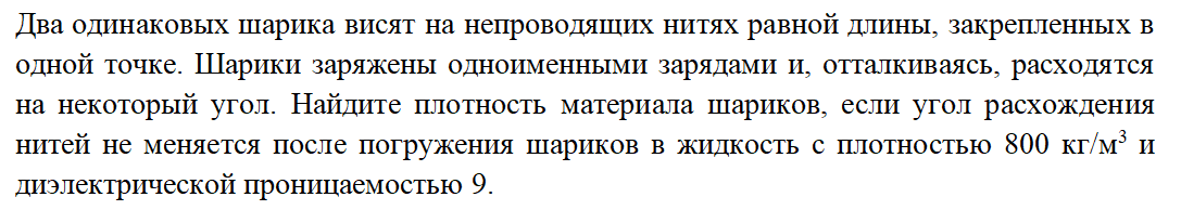 Полное условие задачи: Краткое условие задачи: Решение задачи: Изобразим на рисунке один из шариков до и после погружения в жидкость. До погружения на шарик действуют сила кулоновского отталкивания и сила тяжести, сумма которых должна быть направлена по нити (она уравновешивает силу натяжения нити, которую на рисунке не станем указывать). После погружения в диэлектрическую жидкость кулоновская сила уменьшится в ε раз (расстояние между зарядами не изменилось). Одновременно уменьшится и общая вертикальная сила, так как на шарик начнет действовать выталкивающая сила. Равнодействующая горизонтальной и вертикальной сил должна быть опять направлена по нити, т. е. под тем же углом к вертикали. Из подобия треугольников сил получаем уравнение: (каждое из этих соотношений равно tg α). Учитывая, что: приходим к уравнению откуда находим плотность материала шариков