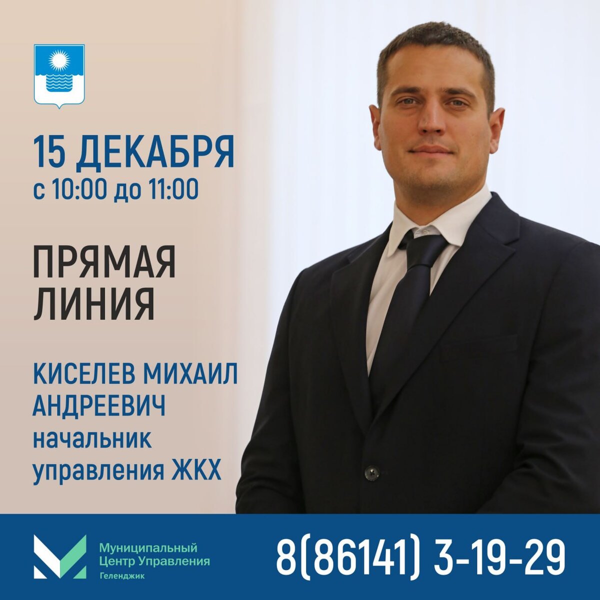 На все вопросы, касательно уборки мусора, придомовых территорий, ремонте дорог и многого другого ответит начальник управления ЖКХ Геленджика Михаил Киселев. «Прямая линия» пройдет 15 декабря на базе Муниципального центра управления. Время работы – с 10:00 до 11:00. Телефон «прямой линии»: +7(86141)-3-19-29.