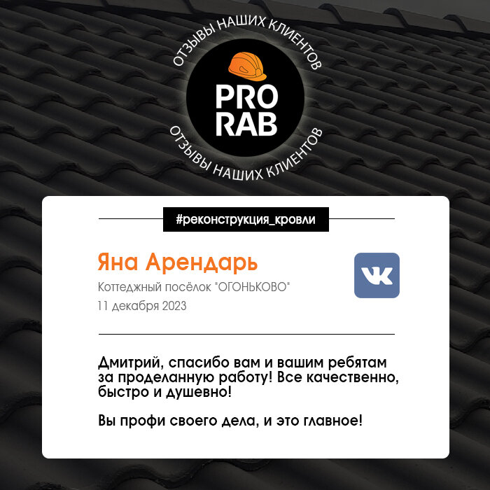 Получили хороший отзыв по реконструкции кровли и о работе строительной бригады. Спасибо за добрые слова и обратную связь! Для нас это очень важно 😉