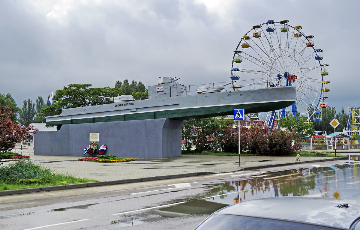 К порту и крепится огромная промзона, где вдоль всё той же Пляжной улицы стоят уже не санатории, а заводы. Пройти вдоль них пешком у меня не было ни сил, ни времени, но даже из окна автобуса нашлось, что поснимать - каждый (!) завод тут снабжён своим памятником Победы, по концентрации которых на душу населения, как вы могли убедиться выше, Ейску явно равных нет. Герой-моряк - у пересобранного в 1944 году для нужд Азовской военной флотилии судоремонтного завода: