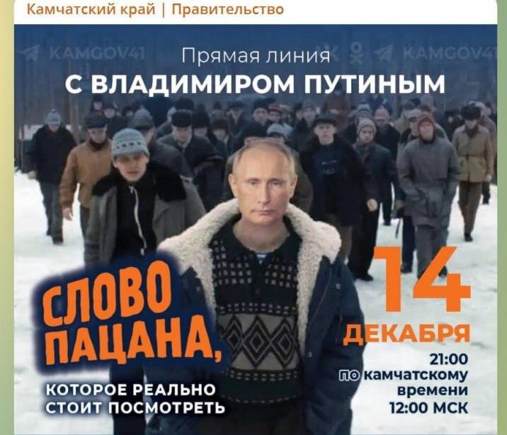Власти Камчатки подтягивают зрителей на прямую линию президента «Словом пацана». Об этом 13 декабря сообщает «Камчатка-Информ». Какие только уродливые формы не принимает рьяное желание клерков в органах власти выслужиться перед начальством. «Творчество» в таких случаях сильно бьет по имиджу руководителей и создает повод для нелицеприятных комментариев. Ярким примером стала инициатива чиновников Камчатки. В официальном телеграм-канале правительства региона они разместили анонс мероприятия с главой государства, стилизованный под нашумевший сериал «Слово пацана. Кровь на асфальте».