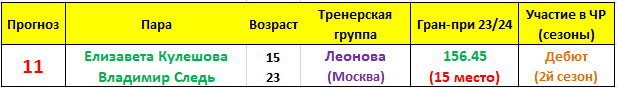 Пара, которая появилась на свет по ходу прошлого сезона. Для Владимира это это уже 6я партнерша в его карьере, а для Лизы третий партнер. Есть уверенность, что данный вариант пары далеко не окончательный и ребята продолжат свои поиски. Пока результаты не самые впечатляющие, а на Чемпионате России мы увидим эту пару только по причине большого числа форс-мажорных снятий. На большее, чем на последнее 11 место Елизавете и Владимиру в Челябинске рассчитывать будет сложно.