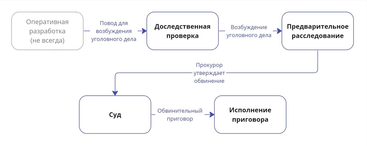 Эта статья — о том, как уголовное дело появляется на свет, как развивается и какие у него могут быть исходы. Здесь мы рассмотрим вопрос в самом общем виде, а подробно каждую стадию будем разбирать в следующих статьях.