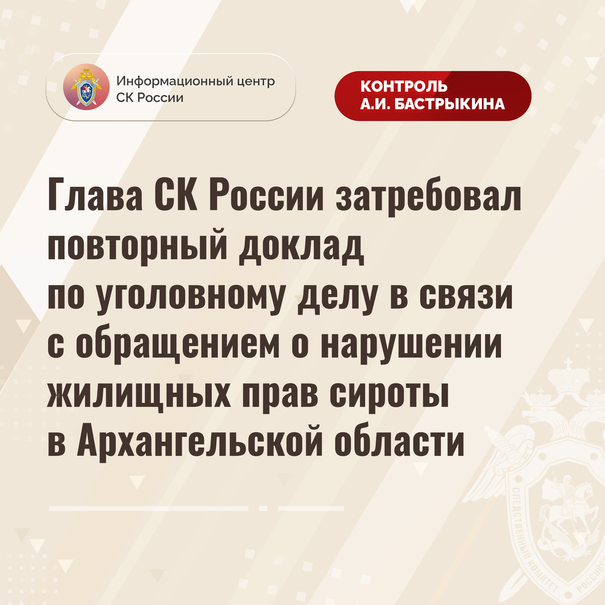 Председатель Следственного комитета Российской Федерации Александр Иванович Бастрыкин затребовал у и.о. руководителя СУ СК России по Архангельской области и Ненецкому автономному округу Михаила Сергеевича Нибаракова повторный доклад о проведенном по уголовному делу комплексе следственных действий и установленных обстоятельствах, а также поручил принять необходимые меры по восстановлению жилищных прав сироты.