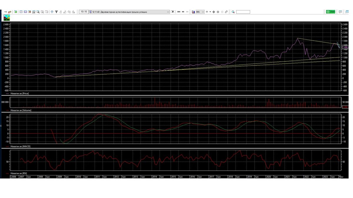 3. Новостной фон постепенно ухудшается, компания НОВАТЭК молчит, это оказывает помощь медведям. Акция на рынке медленно сползает вниз, от резкой просадки удерживает не принятое еще решение по ставки ЦБ РФ и новые санкции. Если все будет принято в положительную сторону, тогда пойдем по варианту: 2. Принимают скатываемся в отрицательную сторону, концу года находимся на уровень 1400. В начале января можем двигаться по линии поддержки, будем смотреть, как будут реализоваться принятые санкции или заходимся в коридоре 1300-1400 до середины января 2024 года. Концу января 2024 года находимся на уровне 1300 или под ним, без стремления двигаться дальше вниз.
