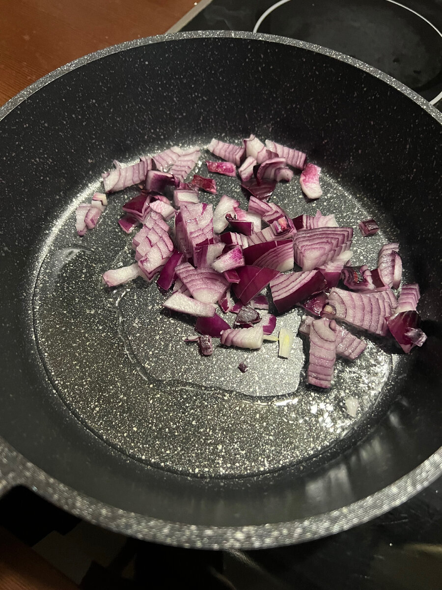 Мелко режем лук и обжариваем, в то время нарезаем курицу