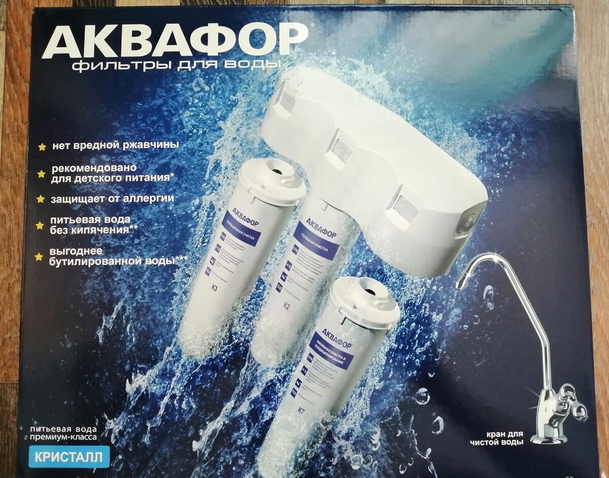 Для очистки воды пользовались фильтром-кувшином "Аквафор" с сменными модулями. По качеству фильтрации очень даже устраивал. Единственное напрягало, что надо каждые 1,5 - 2 месяца менять модуль, ну не буду скрывать - мытьё самого кувшина тоже не быстрая и не очень приятная процедура. Решили купить фильтр под мойку "Аквафор Кристалл А", чтобы хотя бы на год забыть о смене модулей и мытье кувшина. Почему именно "Аквафор"? Потому что фильтр-кувшин данной марки себя зарекомендовал хорошо. Так же перед покупкой проконсультировались у продавца, которая очень уж их нахваливала, уверила, что фильтровать будет не хуже чем кувшин. На решение купить так же повлияло большое количество положительных отзывов в интернете. Купили в торговом центре у официального дилера фильтров "Аквафор". Монтаж не заказывал - установил сам. Инструкция в комплекте, всё понятно по установке. Комплектация полная, на внешний вид хорошего качества. Так данный фильтр выглядит в собранном виде и готов к использованию. На д