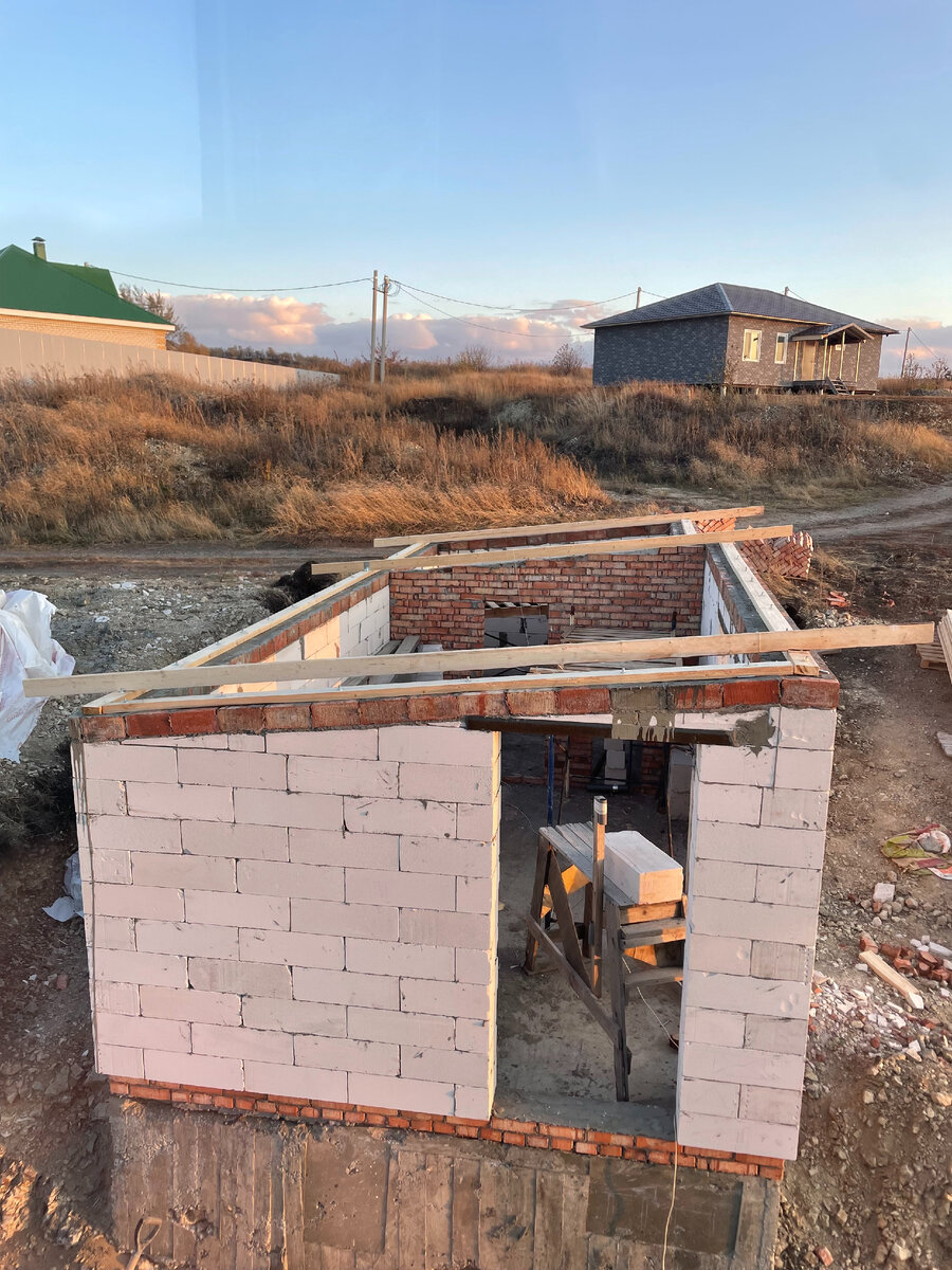 Всем привет! Достроили мы стены и приступили к крыше. Рассчитывали материал мы с теми же строителями которые выкладывали стены. Брус 150х50 мм на лаги 16 штук, Доска 100х25 - 1 куб. По своей ошибке заказал я не 150 мм. Брус, а на 100 мм. Ну решил ладно Будет не 150 мм. утеплитель, а 100 мм. Кстати помониторил я стоимость работ по сборке крыши, цена колеблется от 2000 р. до 3000 р., а у меня 50 квадратов - это 150 тыс. рублей только работа. Крышу собирать я позвал в помощь брата и отца. В первый день положили мы брус на Мауэрлат, закрепили его гайками с шайбами на шпильку 12 мм. Далее положили мы 3 лаги по краям, предварительно замерив расстояние между лагами, чтобы потом уложить утеплитель 600х1000мм.