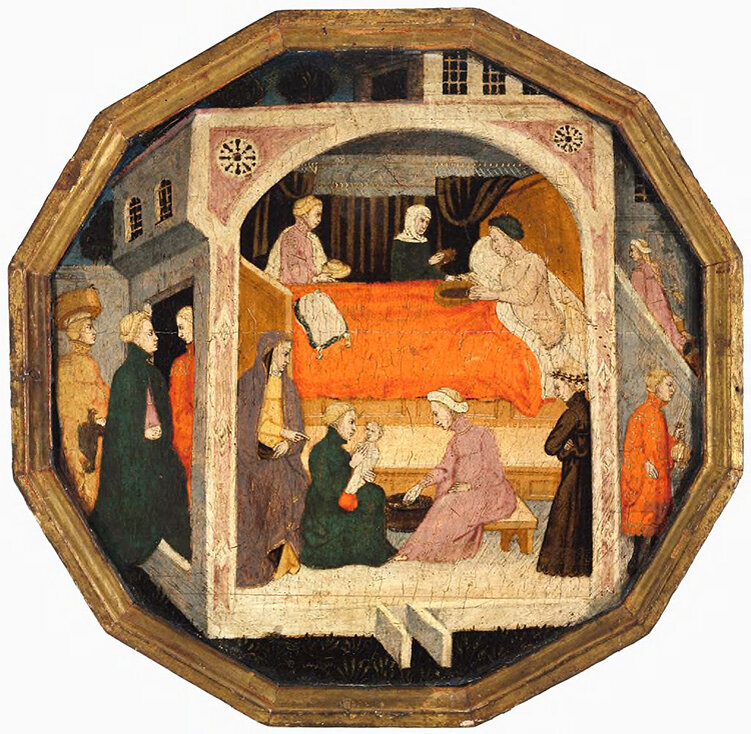 Предыдущая часть: Первая часть: Многие артефакты флорентийского дома свидетельствуют о важности деторождения. Часто во время свадебных торжеств ребенка торжественно помещали на руки невесты, а "святые куклы", обычно одетые как Младенец Христос или святая, составляли часть приданого юных невест. Они были предназначены для того, чтобы привести женщин и детей к Богу через игру, в которой они почувствовали бы и заново пережили детство Иисуса, приобретая в то же время навыки материнства; они также служили оберегом, с помощью которого молодая женщина надеялась магическим образом родить ребенка с достоинствами святого человека, представленного этой куклой. В домашних описях и дневниках мужей зафиксированы значительные расходы на многие предметы. Некоторые из них, например стульчики для родов и пеленки, имели практическое значение. Но большинство предназначались для украшения матери, ребенка и спальни в честь торжественного события. Были специальные одежды, которые мать могла носить во вре
