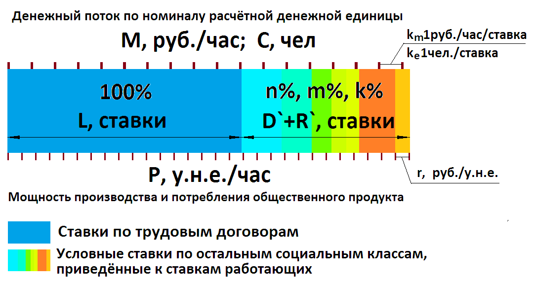 Средние подушевые доходы по остальным социальным классам/группам населения определяются через специфические для каждой из них (класса/группы обобщённо) групповые коэффициенты к доходу среднего работающего, то есть как доля единицы. Данные коэффициенты - это не объекты наблюдения, а объекты утверждения (фиксации) и неукоснительного соблюдения через коррекцию индивидуальных доходов лиц в автоматическом режиме. Таким образом создаются предпосылки для точного (не приблизительного) контроля за объёмом оборачиваемой денежной массы и постоянство во времени ценности её номинала. Описываемые ниже механизмы реализуют это, переводя только что сформулированное из теоретической плоскости в практическую.