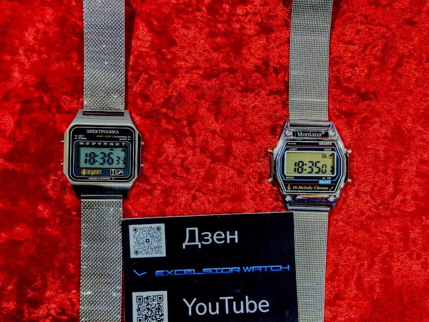 Сегодня, я сравню две легенды, двое часов, которые так дороги сердцам людей. Легендарные часы Montana: И не менее легендарные часы Электроника 77А/1185Н, которые были предоставлены интернет магазином часов Электроника fromussr.ru, являющийся официальным дистрибьютором компании ТехноЧас Балы буду начислять по пяти бальной системе, в конце посчитаю и объявлю победителя. Ну что же, джентльмены, погнали! Характеристики Из характеристик мы видим, что часы Электроника 77 на голову опережают часы Монтана. Все дело в подходе компании ТехноЧас к производству. А именно, максимальная аутентичность, но в более качественном стальном корпусе, с прекрасной отделкой. Возможно, той азиатской фирме, которая сейчас "штампует" часы Монтана, стоит поучиться у парней из Беларуси! Дисплей Что касается дисплеев, то они похожи. Подложки конечно же имеют разный оттенок, и цифры у Электроники более изящные. Но дисплей Электроники лучше читаем при определенных углах! 5 балов Электроника, 4 балла Монтана. Цена Ч