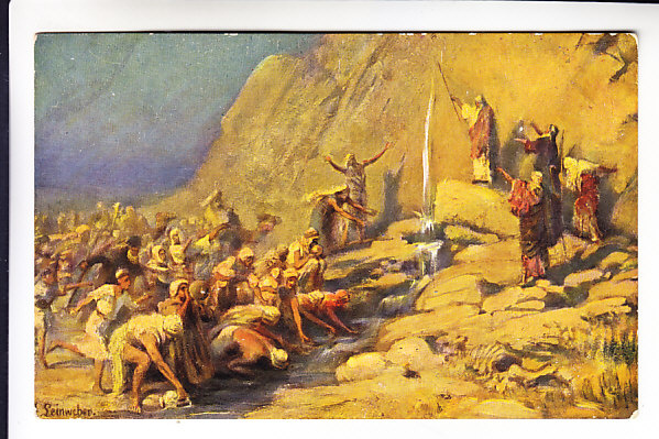 "И двинулось всё общество сынов Израилевых из пустыни Син в путь свой, по повелению Господа; и расположилось станом в Рефидиме, и не было воды пить народу. И укорял народ Моисея, и говорили: «Дайте нам воды пить». И сказал им Моисей: «Что вы укоряете меня? Что искушаете Господа?» И жаждал там народ воды, и роптал народ на Моисея, говоря: «Зачем ты вывел нас из Египта? Уморить жаждою нас и детей наших и стада наши?» Моисей возопил к Господу и сказал: «Что мне делать с народом этим? Ещё немного — и побьют меня камнями»" (Исх. 17:1–4).