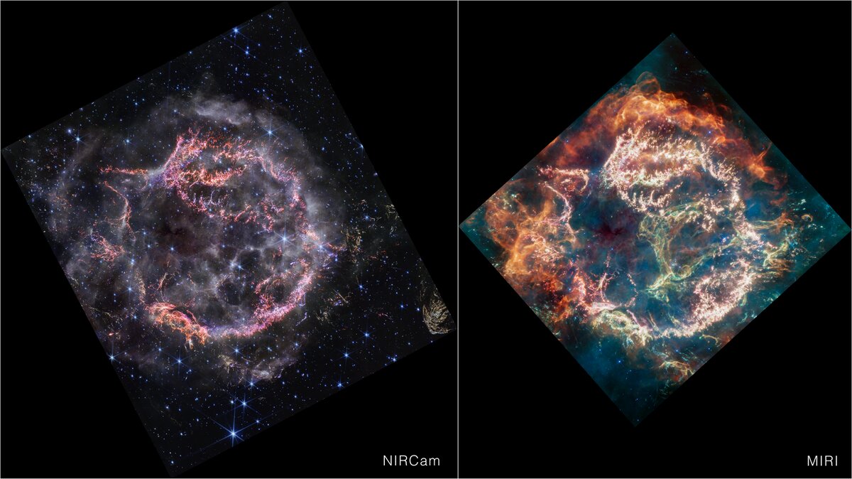 Космический телескоп «Джеймс Уэбб» поразил мир потрясающим изображением в высоком разрешении взорвавшейся звезды Кассиопея А (Cas A). На снимке остаток сверхновой звезды виден с беспрецедентной четкостью. Камера ближнего инфракрасного диапазона (NIRCam) «Уэбба» запечатлела сложные детали расширяющейся оболочки, обнажив столкновение внутренней оболочки с материалом, выброшенным взорвавшейся звездой. Яркие цвета подчеркивают различные активности внутри Cas A: оранжевые и розовые сгустки представляют газы внутренней оболочки. На снимке также можно увидеть загадочного «Зеленого монстра». Хотя «зеленый» цвет не виден в NIRCam, то, что осталось в ближнем инфракрасном диапазоне в этой области, может дать представление о загадочной особенности. Круглые отверстия, видимые на изображении MIRI, на изображении NIRCam слабо очерчены бело-фиолетовым излучением — это представляет собой ионизированный газ. Исследователи полагают, что это происходит из-за того, что обломки сверхновой прорываются сквозь