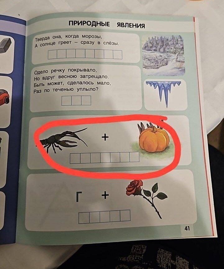 В сети в последнее время "гуляет" ребус, на котором изображены рак, к которому прибавлена тыква. Ничего особенного, картинка из совсем уж детской книжки и задание не выглядит сложным, однако вопрос вызывает у многих замешательство. Немного об истории ребуса Утверждается, что ребус этот стал популярен благодаря тому, что распространился в социальной сети Твиттер, который, как известно, относится к запрещенным в России. Страница учебника, с которого было сделано фото с ребусом, посвящена природным явлениям, а это сбивает с толку гадателей и затрудняет разгадку. В чем секрет? Стоит внимательно присмотреться к картинке За тыквой, прибавляемой к раку, можно рассмотреть ушки кролика и именно их, а не тыкву, которая находится на переднем плане, нужно прибавлять. В итоге получится слово "ракушки". Ракушки - не природное явление, хотя и созданное природой. Несколько выбивается из тематики, а потому многих сбило с верного пути к разгадке. Тем не менее, это единственно правильный ответ! А вы что