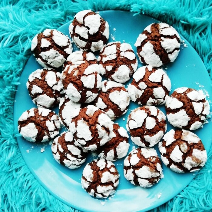 Всем привет! Давно я ничего не писала, решила, что пора исправлять ситуацию) Итак, сегодня будем готовить печенье "Шоколадные трещинки". Для него нам понадобятся: 190 Гр. муки; 60 Гр. сахара; 80 Гр. сливочного масла; 150 Гр. тёмного шоколада; 2 Яйца С0; 5 Гр. разрыхлителя; 1 Гр. соли; 150 Гр. сахарной пудры. У меня на фото ингредиентов больше, так как я обычно удваиваю порцию. Первым делом в чаше миксера соединяем яйца и сахар. Оставляем взбиваться минут на пять. Пока яйца взбиваются, растапливаем шоколад и сливочное масло. Тем временем яйца у нас уже взбились. К ним добавляем шоколадную массу. Перемешиваем. Затем засыпаем муку, разрыхлитель и соль. Ещё раз перемешиваем. Тесто готово. Теперь нужно отправить тесто на пару часов в морозилку. Я обычно убираю тесто в зиплок и разравниваю его внутри пакета, так застывает быстрее. Через пару часов достаем тесто из морозилки и начинаем делать печенье. Формируем из теста шарики размером с грецкий орех. Лучше всего это делать в перчатках. Если