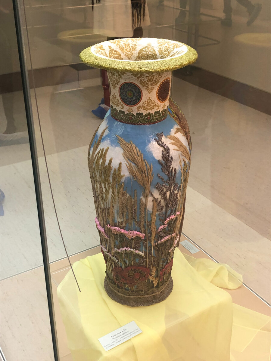 Встречались ли вам эти изделия в административных помещениях? Начну свой рассказ с глиняных ваз, которые увидела на выставке . Оказывается на них, как на художественных полотнах, можно отобразить природу. На их изогнутых поверхностях увидела умело вырисованные луга с травами. Каждая ваза – маленький уголок природы, запечатленный в глине. Сила этих деталей – в мастерстве художника. Глиняные вазы приносят не только красоту, но и атмосферу природного волшебства. А следующая ваза мне напоминает море Мастерство рук и любовь к природе соединились в этих произведениях. В каждом витке лепного узора чувствуется симбиоз с природой. Взглянув на них, можно как бы прогуляться в этих местах и почувствовать жизнь и дыхание природы. В резьбе по гипсу на панно, показанных на выставке, воплощена гармония религии и природы, городской пейзаж. На эти панно композиция подчеркивает вечность дух
