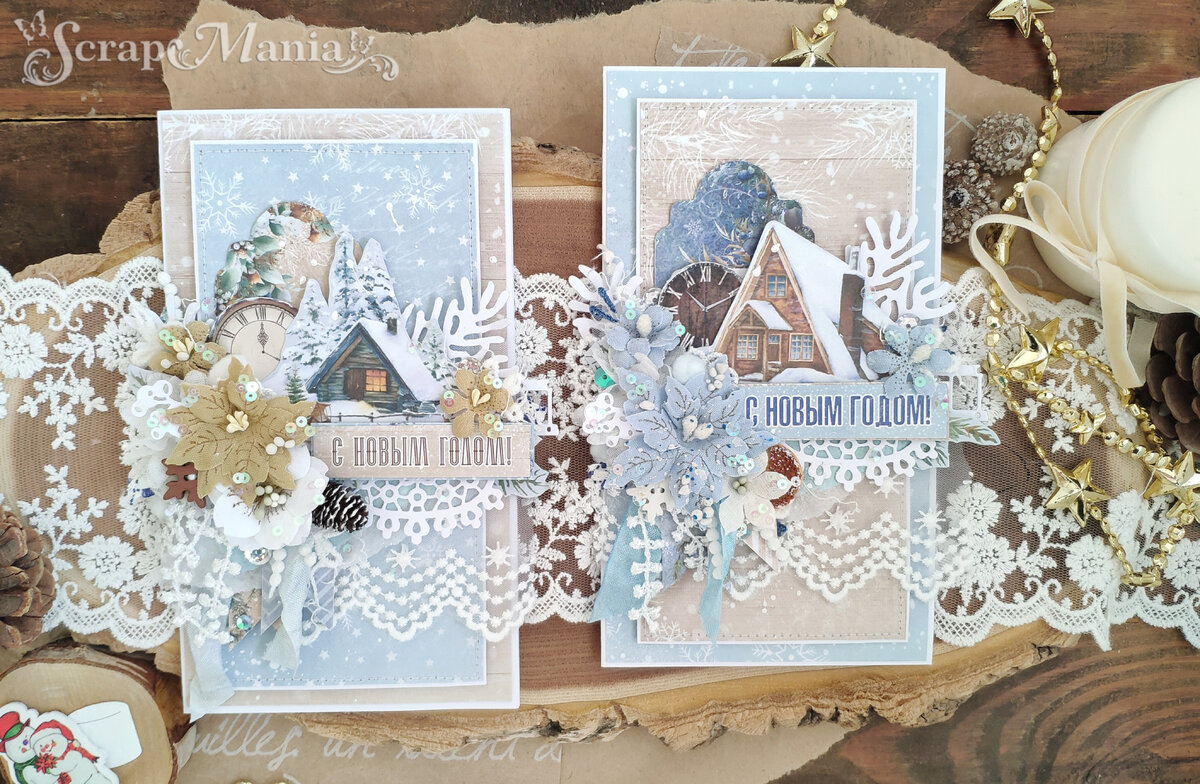 Всем творческий привет! Сегодня с Вами Наталья Конопкина. Oчень рада присоединиться к команде ТМ ScrapMania и вдохновлять Вас на протяжении трёх месяцев. Совсем скоро наступит Новый год - время радости, волшебства и подарков. Поэтому моя первая работа в качестве приглашенного дизайнера - это пара новогодних открыток, выполненных из коллекции "Дачный Новый Год". Данная коллекция сразу пленила мое сердце. А её палитра ассоциируется с зимними сказками, сияющими снежинками и атмосферным настроением. Давайте поподробнее расскажу об открытках, размер которых 10*18 см. В работе я хотела передать настоящую русскую зиму с обильными снегопадами и трескучими морозами. Поэтому использовала два листа из коллекции - "Волшебный шар" и "Саночки", так как у них нежные пастельные оттенки, которые прекрасно сочетаются между собой. Сама коллекция имеет несколько листов с элементами для вырезания, это всё помогло сделать работу наполненный, многодетальной и необыкновенно красивой. Давайте поближе посмотри
