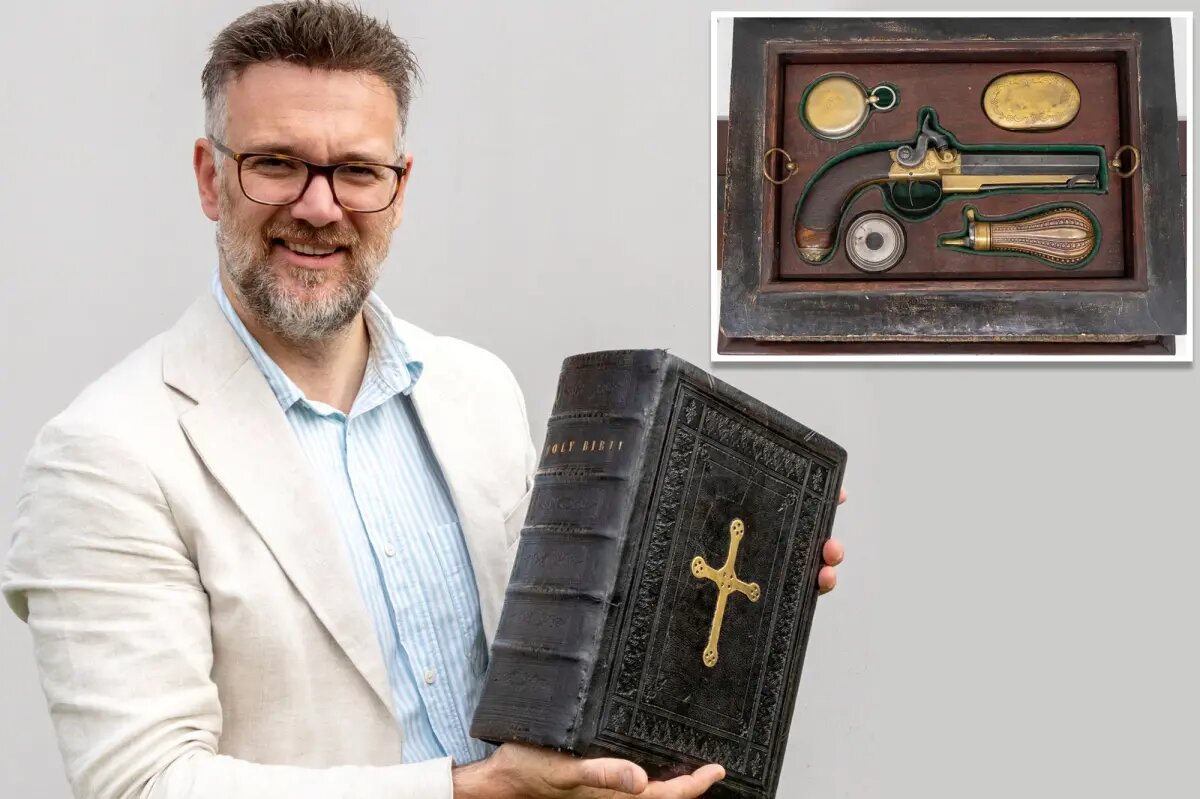 Фанаты «Сумерек» и «Реальных упырей» тут? Все предметы хранятся в большой шкатулке в виде Библии. В набор входит пистолет, латунная пороховница и маленькая подзорная труба. В другом отсеке лежат настоящая Библия, распятие, четки, флакон со святой водой, подсвечники, молоток и кол.