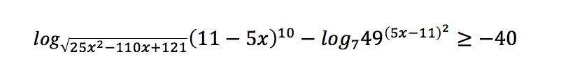 Решим неравенство: 1. Определим область допустимых значений. Так как основание логарифма не может быть меньше нуля, равняться ему или единице, а логарифмируемое число не может быть меньше нуля, то: 2. Упростим логарифмы, стоящие в неравенстве: 3. Теперь объединим полученный интервал с ОДЗ. Так как 11/5 и 12/5 попадают в него, то эти точки необходимо из этого интервала удалить. Получится: Ответ верный. Остались вопросы? Задайте их в комментариях! Я обязательно на них отвечу.