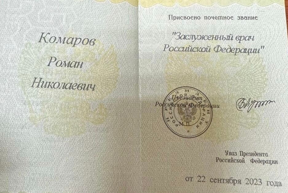 Уважаемые друзья, коллеги и пациенты! Сегодня я хочу поделиться с вами радостной новостью и своими чувствами по этому поводу. Недавно мне была оказана честь получить звание "Заслуженный врач России". Это большое признание для меня как специалиста и как человека, отдавшего сердце медицине. Моя профессия для меня - это не только работа, это моя жизнь, моё призвание. Каждый день, проведённый в операционной, каждая успешно проведённая операция, каждая улыбка пациента после восстановления - это то, что действительно важно. Эта награда - это не только моя заслуга, но и заслуга моей команды, с которой мы вместе преодолеваем трудности и достигаем успеха. Я благодарен каждому, кто был со мной на этом пути. Пусть этот успех будет напоминанием для всех нас о важности упорства, стремления к знаниям и гуманизма в медицине. Вместе мы делаем мир здоровее! С уважением и благодарностью. Комаров Роман