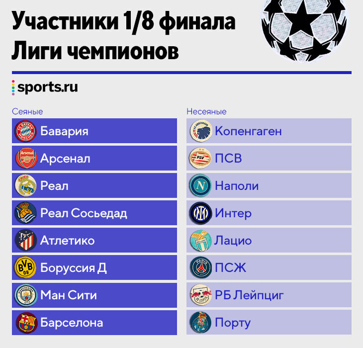Теперь мы знаем всех участников плей-офф Лиги чемпионов. В среду добавились «Порту» и «ПСЖ», а уже вышедшие «Атлетико», «Лацио», «Боруссия» и «Барселона» определились с местами. У четырех топ-лиг по несколько команд: четыре клуба из Испании, по три – из Италии и Германии, два – из Англии. По одному прошли от Франции («ПСЖ»), Португалии («Порту»), Нидерландов (ПСВ) и Дании («Копенгаген»). «ПСЖ» выполз в плей-офф, «Барсе» снова больно, второй клуб АПЛ вылетел с последнего места. Главное в ЛЧ Жеребьевка 1/8 финала – в понедельник, 18 декабря. Победители групп будут сеяными, команды со второго места − нет. Сеяные ответный матч проведут дома. Соответственно, кому-то из первых мест может достаться, например, «Интер» – прошлогодний финалист (остался вторым из-за «Сосьедада»). Команды из одной группы или одной ассоциации не смогут сыграть друг против друга. «МЮ» и «Ньюкасл» – последние в ЛЧ. Хотя до них за 30 лет так проваливали лишь три команды АПЛ Первые матчи сыграют 13, 14, 20 и 21 февраля