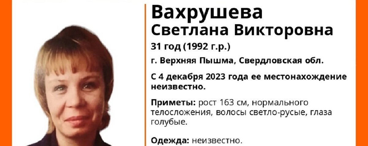 Поиск женщины продолжают сотрудники полиции и волонтеры из регионального отделения поискового отряда «ЛизаАлерт». По данным Е1, 31-летняя жительница Верхней Пышмы Светлана Вахрушева исчезла 4 декабря в Екатеринбурге. При этом мать четверых детей перестала выходить на связь с родными. В день исчезновения она отвела ребенка в школу в районе Уралмаша. Уже 12 декабря пропавшая женщина внезапно вышла на связь и сообщила сестре, что находится в каком-то подвале и выразила просьбу, чтобы родственница забрала ее из незнакомого места. Со слов сестры Вахрушевой стало ясно, что женщина доехала до конечной остановки трамвая, где ей стало дурно. Аналогичную информацию подтвердили полицейские из Верхней Пышмы. Согласно сведениям стражей правопорядка, звонок сотрудников угро с Вахрушевой состоялся в ночь с 12 на 13 декабря. В ходе него женщина в категорической форме отказалась от какой-либо помощи. Также известно, что Светлана Вахрушева не сообщили полиции и родственникам своего актуального местополо
