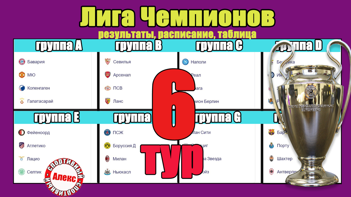Привет, уважаемые любители футбола. Вы на канале «Алекс Спортивный». Во вторник 2 клуба присоединились к участникам 1/8 финала ЛЧ. Полный список в конце. Начинаем с группы Е. Атлетико победил Лацио 2-0. Пользователи одного популярного зарубежного сайта отдали 57% своих голосов на победу Атлетико. Откуда они знали результат? В Риме зафиксирована ничья 1:1. . Лидер шотландской премьер-лиги Селтик обыграл Фейеноорд 2:1. Напомню, Фейеноорд победил дома в 1-м туре 2:0, имея на 2 игрока больше. К тому же не реализовав пенальти. Итоговая таблица группы Е. Атлетико и Лацио выходят в плей-офф. Для Лацио важно сыграть в этом сезоне хорошо, потому что в чемпионате они только 10-е и могут пропустить следующий розыгрыш. Фейеноорд сыграет в Лиге Европы. Селтик выбыл. . Кто вышел в группе F? Боруссия (Дортмунд) и ПСЖ закончили вничью 1:1. В первом круге ПСЖ выиграл на своем поле 2:0. Команды встретились в 6-й раз Парижане подошли к игре с серией из 5-ти матчей без поражений. . Миланом вырвал волевую