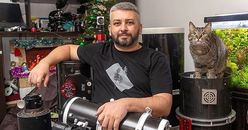 — Нет, но мне самому с детства было интересно, что там, наверху. А началось всё с микроскопа, который мне купили в первом классе. Берёшь из аквариума капельку, а там целый мир — меня это очень всё впечатляло. Наблюдал, зарисовывал то, что вижу, а потом шёл в библиотеку, чтобы определить, что это. В библиотеке были журналы «Наука и жизнь», «Земля и Вселенная», на одной из обложек как-то увидел Сатурн и надпись: «Учёные сняли шторм на Сатурне»… Первым моим телескопом был «Алькор». Цифровых приёмников тогда не было, и я придумал, как использовать фотоаппарат «Зенит»: с помощью картонных втулок и синей изоленты сделал камеру, дающую окулярную проекцию, и стал фотографировать. А потом с этими снимками неожиданно победил на областной выставке технического творчества. Помню, как мама беспокоилась, когда я шёл на улицу с телескопом: «Куда ты пойдёшь?». Времена были неспокойные, конец 1990-х, во дворе гопники клей в пакетах нюхали. А я шёл снимать Марс. «Куда же ты пойдешь, у тебя же даже вспышки нет», — сопротивлялась мама. «Это какая должна быть вспышка, чтобы до Марса добить?!» — смеялся я. А сейчас техника такого уровня, что я уже сам снимаю шторм на Сатурне.