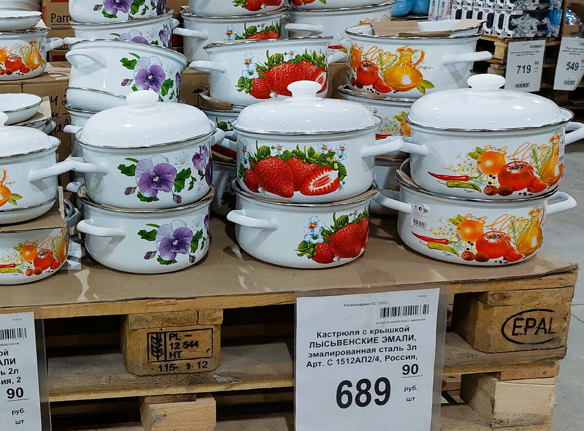 В продаже качественная посуда знаменитой торговой марки "Лысьвенские эмали". Кастрюля с крышкой, эмалированная сталь. Кастрюля на 3л по цене 689,9 руб. На 2л по цене 569,9 руб.