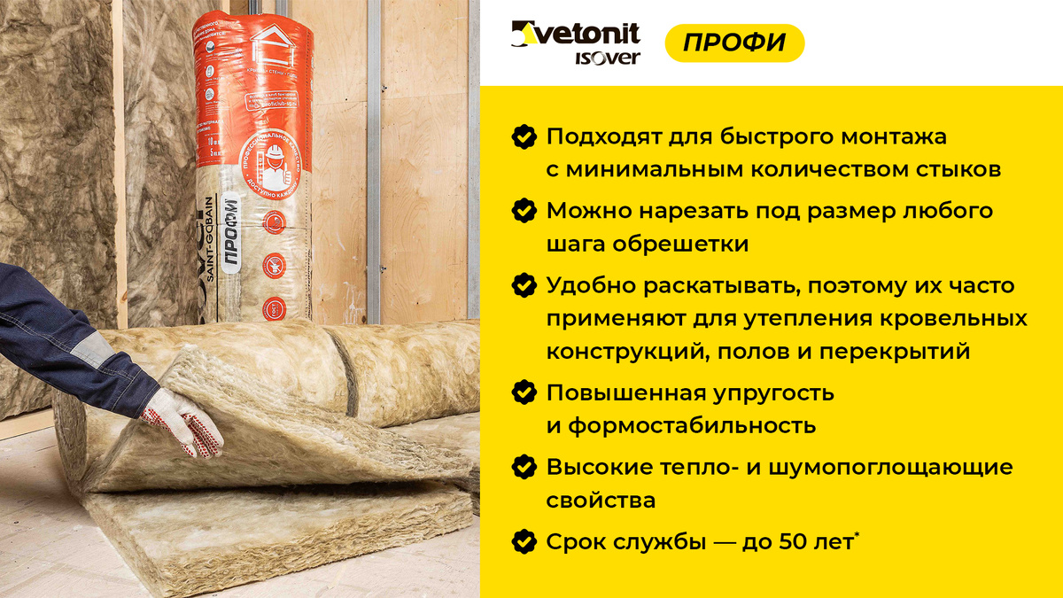 А.М.: Не всегда. Если речь о кровле, где пролеты в скатах длиной по 6 метров, конечно же, ее лучше утеплять рулонами. Главное учитывать, что наклонные конструкции более требовательны к упругости утеплителя, чем горизонтальные. Поэтому для кровли мы рекомендуем утеплитель Isover Теплая крыша Стронг повышенной упругости и со специальными водоотталкивающими добавками.