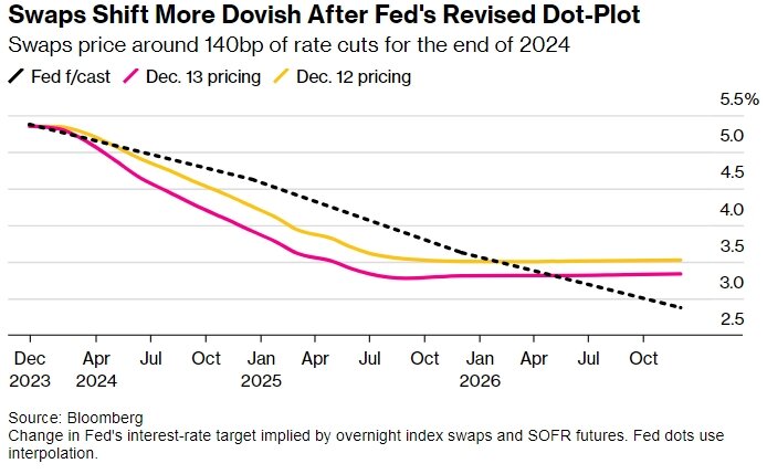 ФРС повлияла на цену свопов в рамках дополнительного смягчения в течение следующих 12 месяцев. Доходность двухлетних казначейских облигаций упала более чем на 30 базисных пунктов. Доходность 10-летних казначейских облигаций США упала ниже 4% впервые с августа, поскольку трейдеры воспользовались сигналом Федеральной резервной системы о том, что процентные ставки достигли пика и в 2024 году их можно будет снизить. Это произошло после того, как в среду рынок казначейских облигаций устроил самое большое однодневное ралли с тех пор, как в марте обанкротились несколько региональных банков. В четверг в Азии ставка по двухлетним облигациям продолжила снижение после падения на 31 базисный пункт на предыдущей сессии, а доходность по 10-летним облигациям торговалась на уровне 3,998%. После своего последнего заседания в этом году политики ФРС опубликовали новые квартальные прогнозы по ставке однодневного кредитования, которую они контролируют, оставив при этом целевой диапазон ставки неизменным на