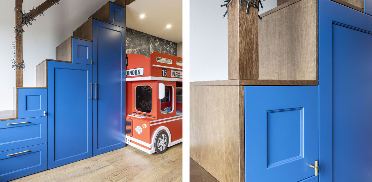 Обустройство детской комнаты - это сложный процесс, который требует обратить внимание на множество факторов. Отталкиваясь от пожеланий и интересов ребенка, необходимо выбрать планировку, разобраться с зонированием, подобрать оттенки и материалы. Задача становится сложнее, когда Ваш ребенок активен, ведь в будущей стране сказок нужно не только разместить место для сна, учебы и другого, но и предусмотреть различные активности. Давайте рассмотрим одну из комнат нашего производство, где запросом стало именно размещение зон для динамичного времяпровождения ребенка. Что думаете насчет лестницы, под которой расположены шкафы и ящики для хранения? Такое интересное решение поможет сэкономить площадь, а также обеспечить необходимый функционал для самой лестницы и шкафов. Для самых активных ребят - движение никогда не заканчивается! Как Вам такое интересное решение? Второй этаж комнаты оборудован сеткой, а попасть туда можно по скалодрому, который понравится каждому ребенку! Также размещена верев