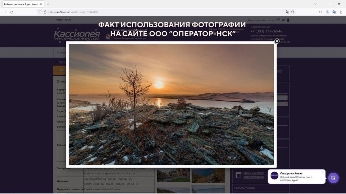 Итак, знакомьтесь: представитель туристического сообщества прекрасного города Новосибирска, турагентство «Кассиопея». А точнее, работающее под этой торговой маркой ООО «Оператор-НСК». Некоторое время назад, бизнесмены решили продвигать внутренний туризм, а конкретно, туры на популярный ныне Байкал. Для визуализации предложения они нашли и скачали в интернете красивое фото. Дабы ничто не отвлекало потенциальных клиентов от предвкушения будущей поездки, с фото была удалена абсолютно не вписывающаяся в атмосферу снимка подпись автора, с указанием сайта.