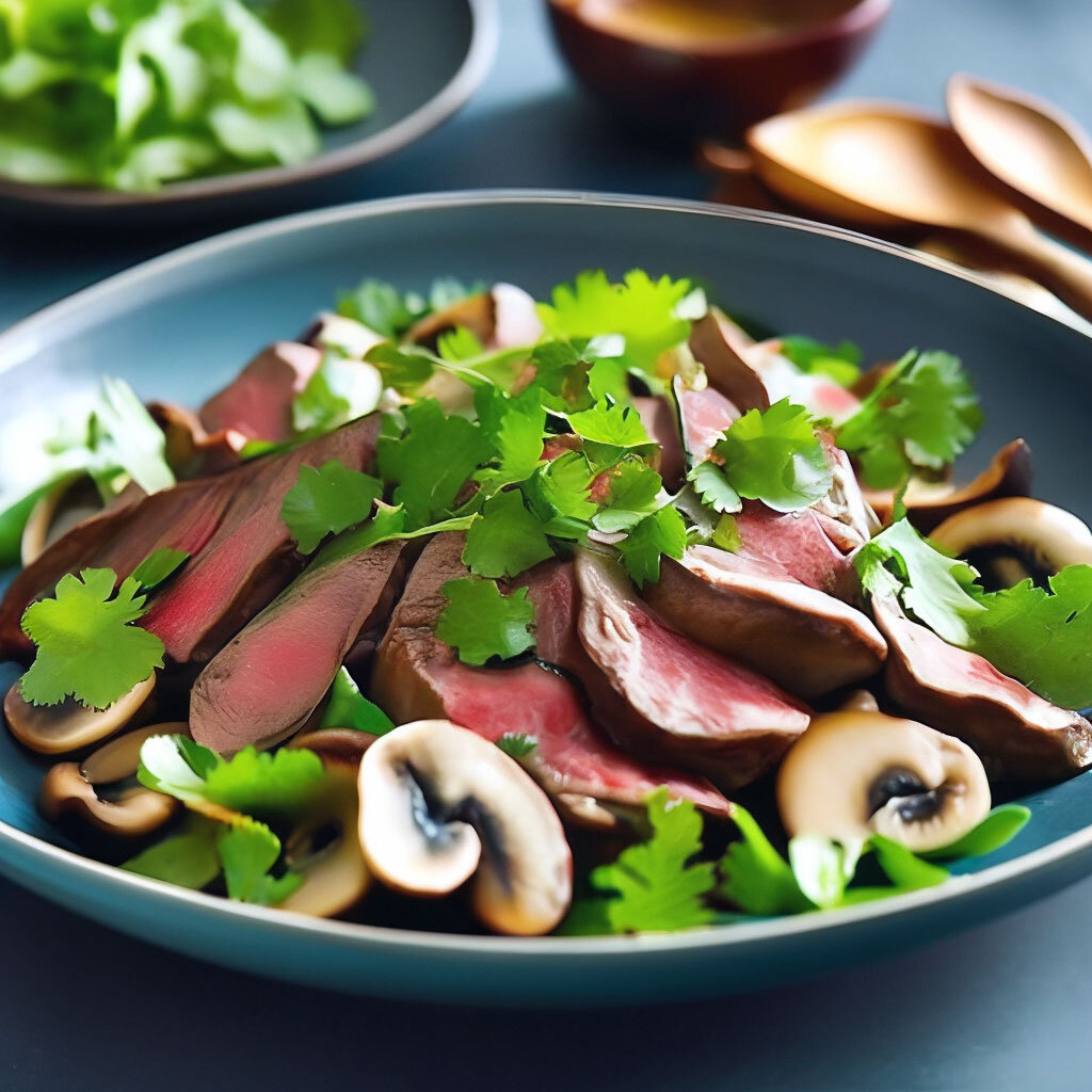 Ингредиенты: - 300 г говядины (отваренной и нарезанной ломтями) - 200 г свежих грибов (порезанных) - 1 луковица (нарезанная полукольцами) - 2 ст. ложки растительного масла - 2 ст. ложки соевого соуса - 1 ст. ложка уксуса - Соль и перец по вкусу - Свежие зеленые листья (кинза, петрушка) для украшения Инструкции: 1. Подготовка ингредиентов: - Готовьте говядину заранее, нарезайте ее ломтями. - Помойте и порежьте свежие грибы. - Нарежьте лук полукольцами. 2. Обжарка грибов и лука: - Разогрейте растительное масло в сковороде. - Обжаривайте грибы и лук до золотистой корки. 3. Приготовление соуса: - В небольшой миске смешайте соевый соус, уксус, соль и перец по вкусу. 4. Сбор салата: - В большой миске соедините готовую говядину, обжаренные грибы и лук. - Постепенно добавляйте приготовленный соус, тщательно перемешивая. 5. Подача: - Украсьте салат свежими зелеными листьями. - Подавайте теплым или охлажденным. Приятного аппетита!