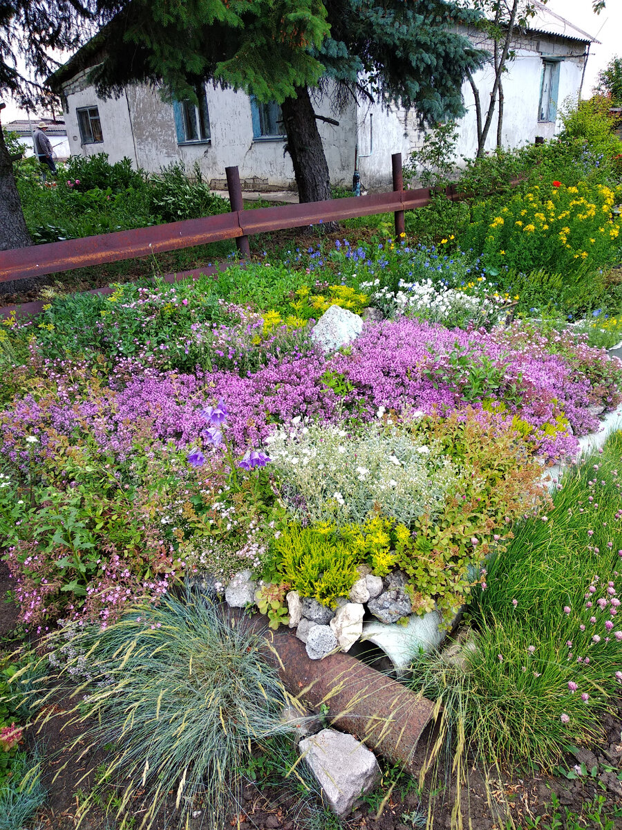 Приветствую вас, друзья мои ! Я все время считала, что у меня в саду есть горки, пусть и небольшие, но есть. Но когда я увидела как правильно создают горки, теперь и не знаю, как свои называть. Пусть будет бугорок на ровном месте. А сейчас давайте посмотрим что на них растет. Вот эта, старая горочка, которая создавалась из мелкой щебенки, песка и земли, все просто перемешано,сверху совсем немного крупных камней, которые я собирала, где могла. Что на ней посажено, а всего по чуть чуть. Мыльнянка, это подружка каждый год старается захватить все больше места для себя, приходится лишнее удалять. Обриета на самом верху, гипсофила белая и розовая рядом с мыльнянкой, ясколка с серебристой листвой. Все выращено из семян, прямым посевом в грунт. Потом начинает цвести тимьян, этого товарища очень много, но когда он цветет, я прощаю ему все. Очитков здесь тоже посажено не мало, разных, цветут они обильно . Разноцветный ковер, как я и люблю и пусть тут нет настоящих альпийцев и посажено все хаоти