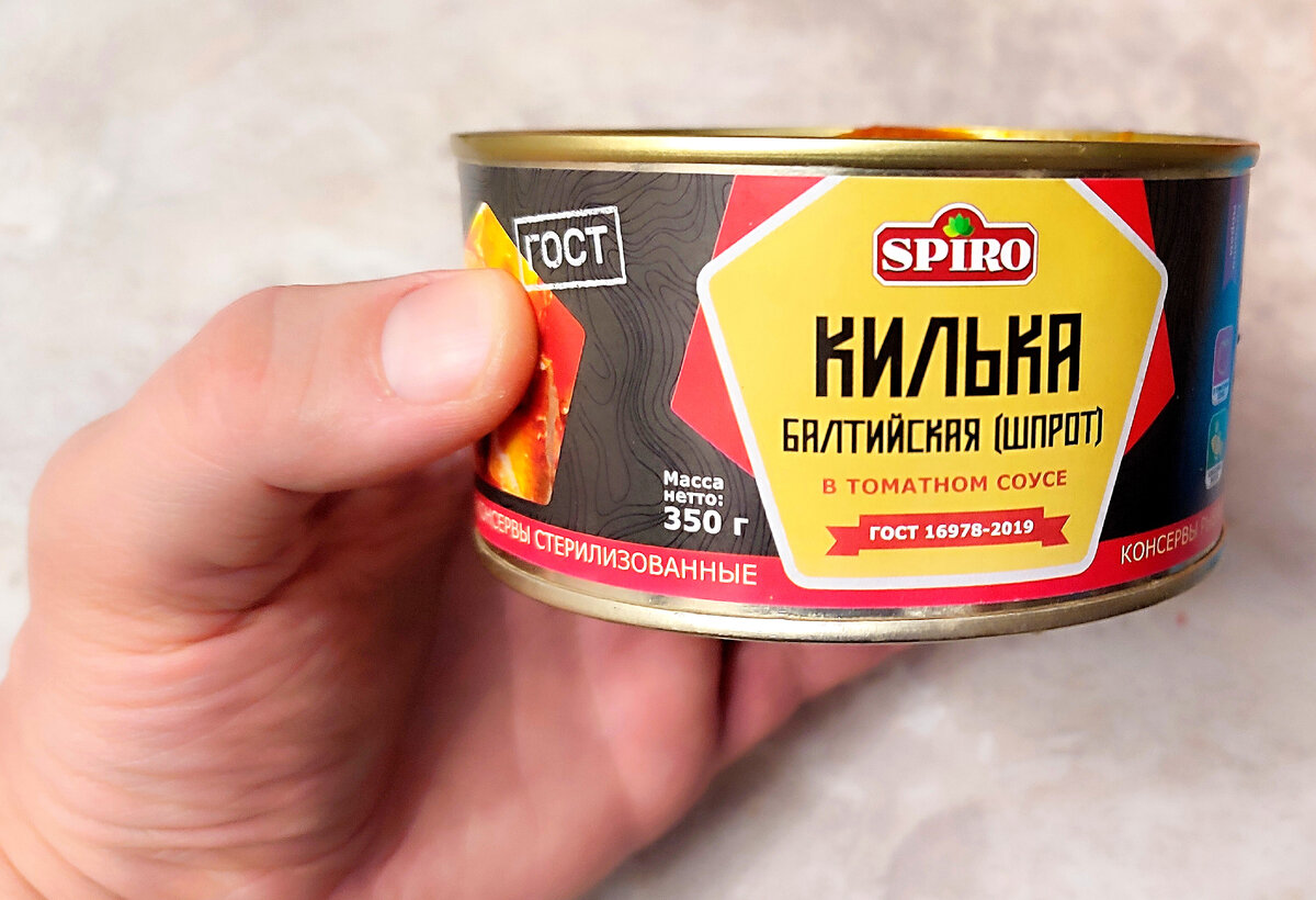 Всем привет! Сегодня буду пробовать балтийскую кульку в томатном соусе неизвестного бренда "Spiro" из Светофора. Такую большую банку вижу впервые. Стандартная банка 240 грамм, а тут целых 350. Да и цена у неë достойная - около 70 рублей. Килька сделана по ГОСТу. На рисунке показан странный вариант сервировки. И вообще там нарисована не килька мне кажется. Ну это так к слову, главное чтобы внутри было всё красиво и вкусно. Состав: килька балтийская неразделанная, томатный соус (вода, томатная паста, сахар, соль, масло растительное, уксусная кислота, лук, сушёный, лавровый лист, перец душистый молотый, кориандр). Наверное я впервые вижу что в составе томатного соуса нету муки. Обычно наоборот в дешёвых консервах еë кладут очень много. Получается килька в томатном тесте, а не в соусе. Произведена из мороженного сырья. Это уже звоночек к тому что внутри будет рыбная каша. Всего масса 350 грамм. Масса рыбы 220 грамм, остальное соус. Изготовитель: ООО "Русский рыбный мир" , г. Москв